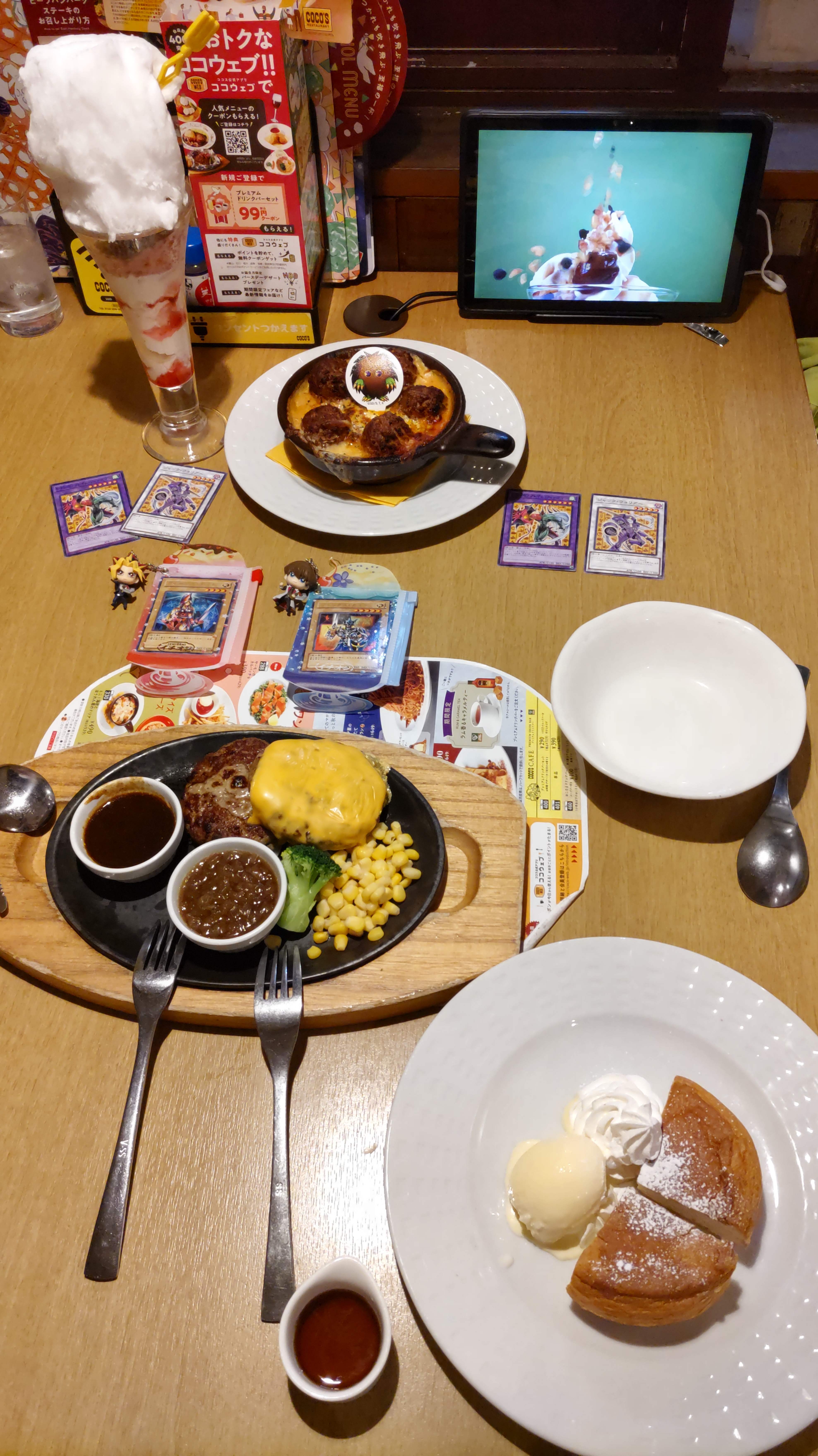 この写真は最近うちの職場に異動になって仲良くなった、また別の同僚と行ってきた時に、私が好き嫌いで頼めなかった別の万丈目メニューを頼んでくれたので、撮らせてもらいました。(※カードは私がせめてものお詫びに渡したやつです)ちなみに私は一回目と同じメニューを食べました。ドローパンは中身違ったけど、トマト食べてもらえて助かった。