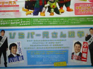深夜で長時間枠のせいでなかなか観れなかったこの番組。以前途中までは観たことあったんですがね。この回はひらパー兄さん選挙(画像参照)の前哨戦ということで、夜のひらパーを貸し切って小杉兄さんチームと吉田兄さんチームに分かれて対決という企画だったので録画して観ました。